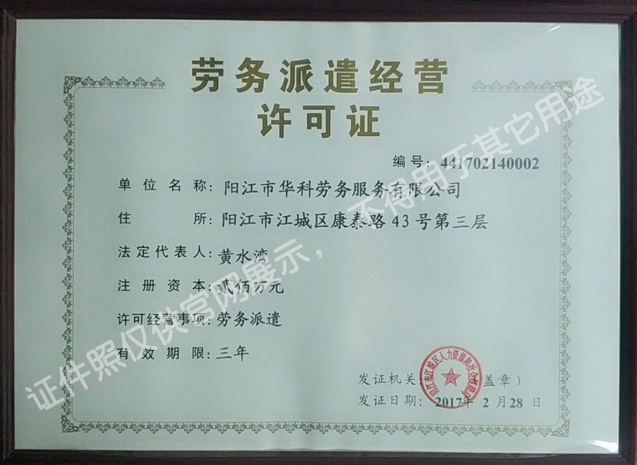 華科勞務(wù)服務(wù)有限公司是專業(yè)從事人事代理、勞務(wù)租賃、人力派遣及管理的綜合性服務(wù)機(jī)構(gòu),是首批獲得廣東省人力資源廳、陽(yáng)江市勞動(dòng)和社會(huì)保障局頒發(fā)人力資源許可證的合法單位。公司秉承“誠(chéng)信務(wù)實(shí)、專業(yè)熱情、滿意第一、服務(wù)社群”的經(jīng)營(yíng)理念,在勞務(wù)派遣業(yè)務(wù)的基礎(chǔ)上,更致力于合同制工人(臨時(shí)工、實(shí)習(xí)生、假期工)方向發(fā)展,為用工企業(yè)及時(shí)輸送合格的各類人才,合理調(diào)配人力資源的有序流動(dòng),幫助求職者尋求更加滿意的就業(yè)渠道和崗位,切實(shí)維護(hù)求職者的合法權(quán)益。